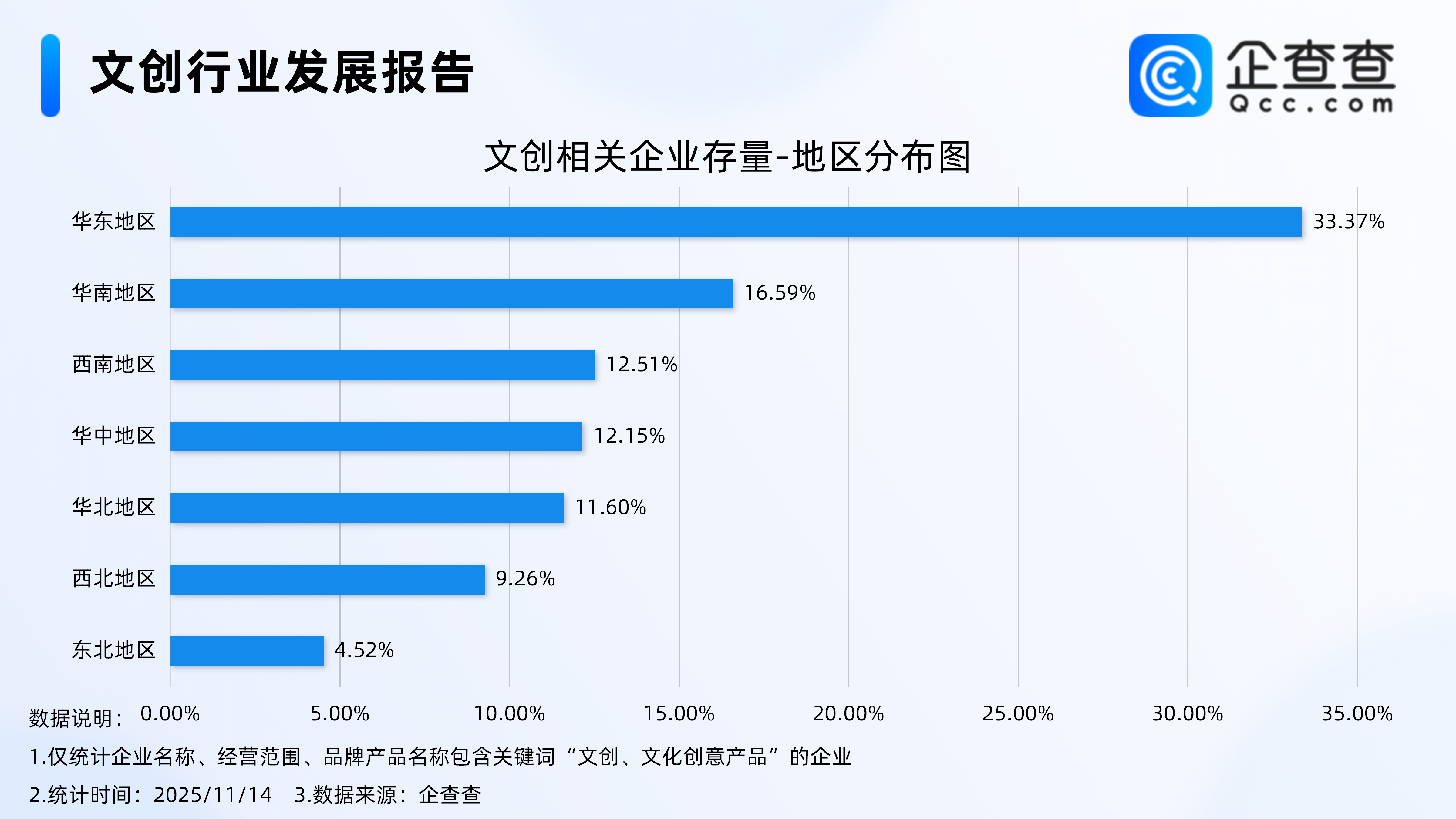 文创产品近年来持续爆火,不仅为博物馆等文化机构带来了可观收入,还带动了设计、加工、服务等相关产业发展。据经济日报,第八届进博会文创产品全新升级,围绕吉祥物“进宝”和国家会展中心(上海)“四叶草”等元素设计文创产品600余款,涵盖徽章饰品、办公文具、杯子茶具等10种不同品类。企查查数据显示,截至11月14日,国内现存文创相关企业3.11万家。存量方面,从地区分布来看,文创相关企业主要集中分布在华东地区,占比达33.37%。注册量方面,近十年相关企业注册量呈整体增长态势,2024年全年注册5328家文创相关企业,同比增长27.53%。截至目前,今年已注册文创相关企业6028家,其中前10月注册5783家,同比增长34.21%。1.现存文创相关企业3.11万家