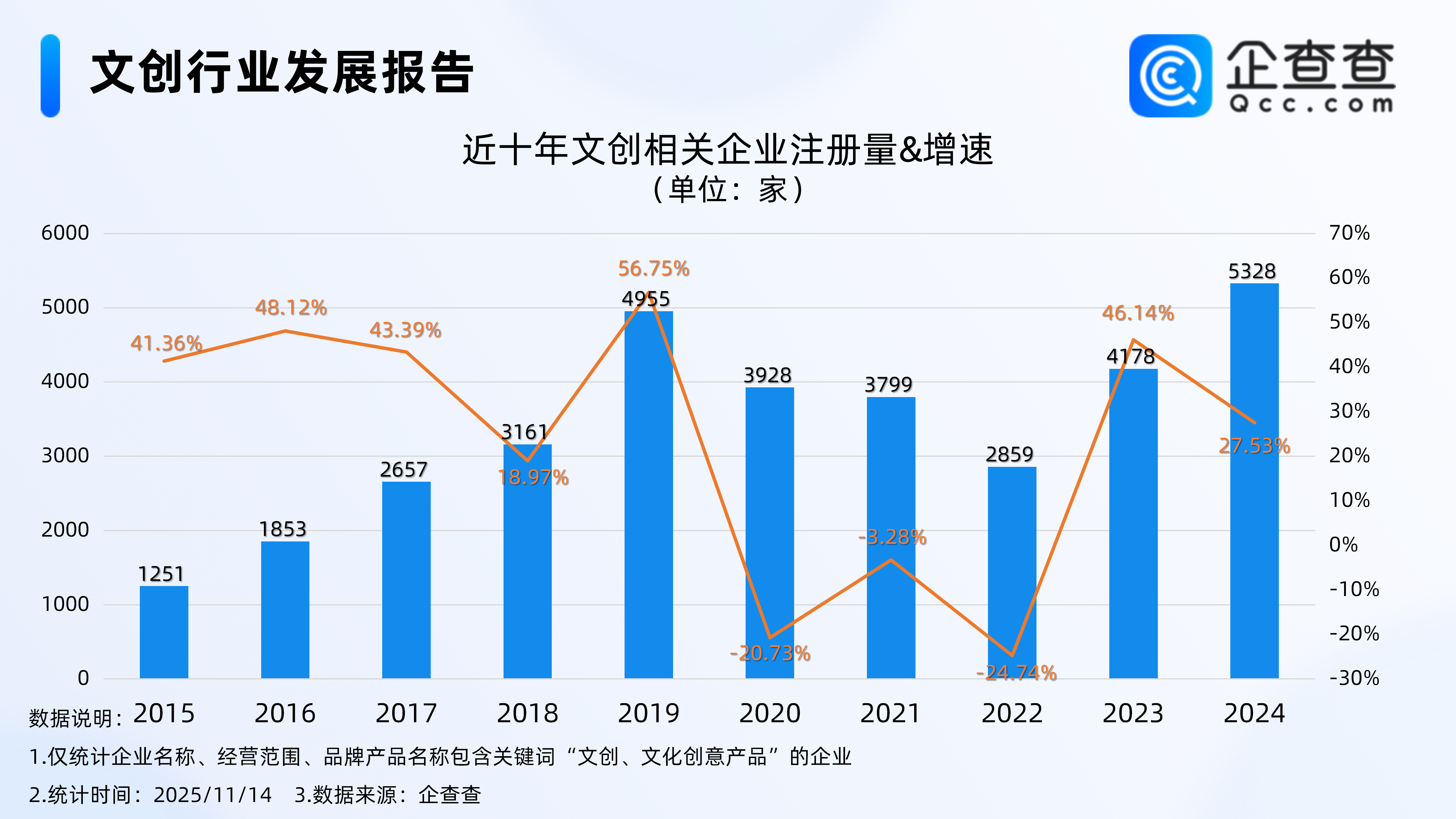 企查查数据显示,注册量方面,近十年相关企业注册量呈整体增长态势,其中2019年全年注册4955家,同比增长56.75%,达近十年注册增速峰值。2024年全年注册5328家文创相关企业,同比增长27.53%。3今年前10月相关企业注册同比增长34.21%